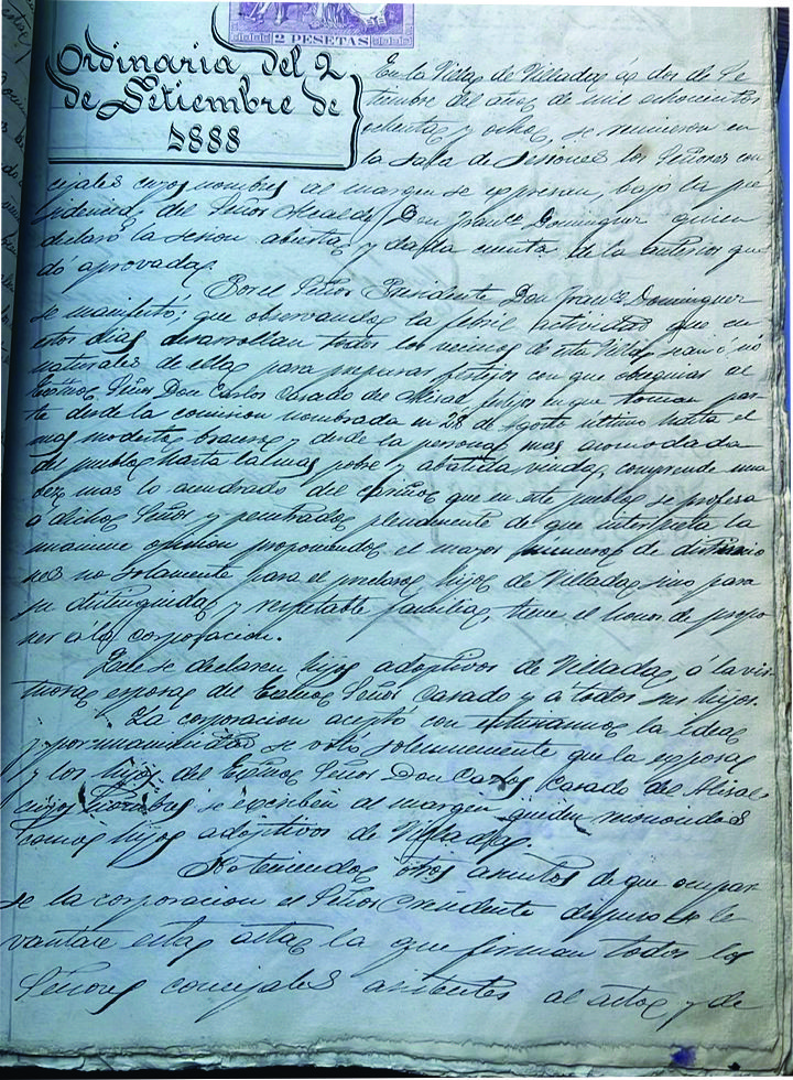 Sesión ordinaria del día 2 de Septiembre de 1888 donde recoge la declaración de hijos adoptivos de Villada a la virtuosa esposa del Excelentísimo Señor Casado y a todos sus hijos. Aceptándolo por unanimidad la corporación.